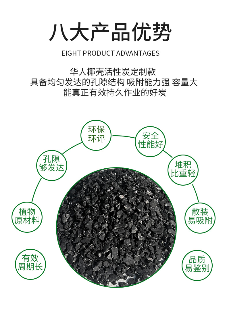 本品采用優(yōu)質椰殼、杏殼、核桃殼等堅硬果殼為原料,經物理的方法精制而成。產品為黑色不定型顆粒狀,具有比表面積大、孔隙結構發(fā)達、吸附能力強、脫色速度快、易再生等優(yōu)點。
