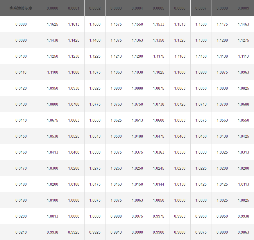 D—校正因子(通過(guò)剩余濾液濃度c從表1中查到);