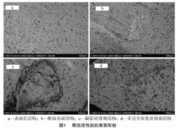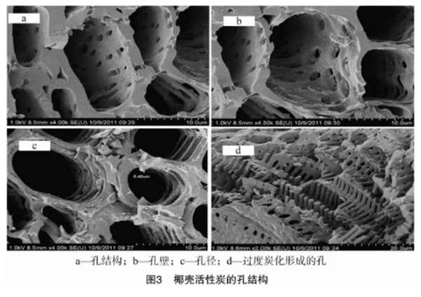 圖3為椰殼炭的電子顯微鏡掃描照片,可以更清楚地觀察到椰殼炭的孔結(jié)構(gòu)。