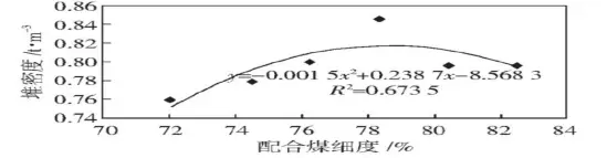 配合煤細(xì)度對(duì)配合煤堆密度、焦炭機(jī)械強(qiáng)度、熱強(qiáng)度及焦炭產(chǎn)量的影響, 用來指導(dǎo)實(shí)際生產(chǎn);在一定條件下, 按照實(shí)際使用的配比, 進(jìn)行不同細(xì)度下配合煤, 尋找配合煤細(xì)度與焦炭質(zhì)量、產(chǎn)量的對(duì)應(yīng)關(guān)系。