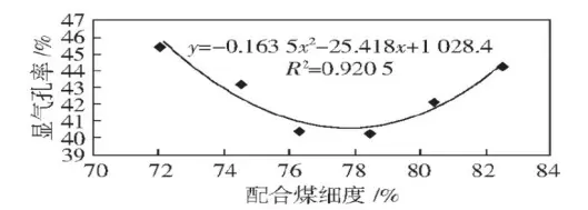 焦炭顯氣孔率隨著配合煤細(xì)度的增加呈拋物線形式, 在約77.5%時(shí)為最低值。