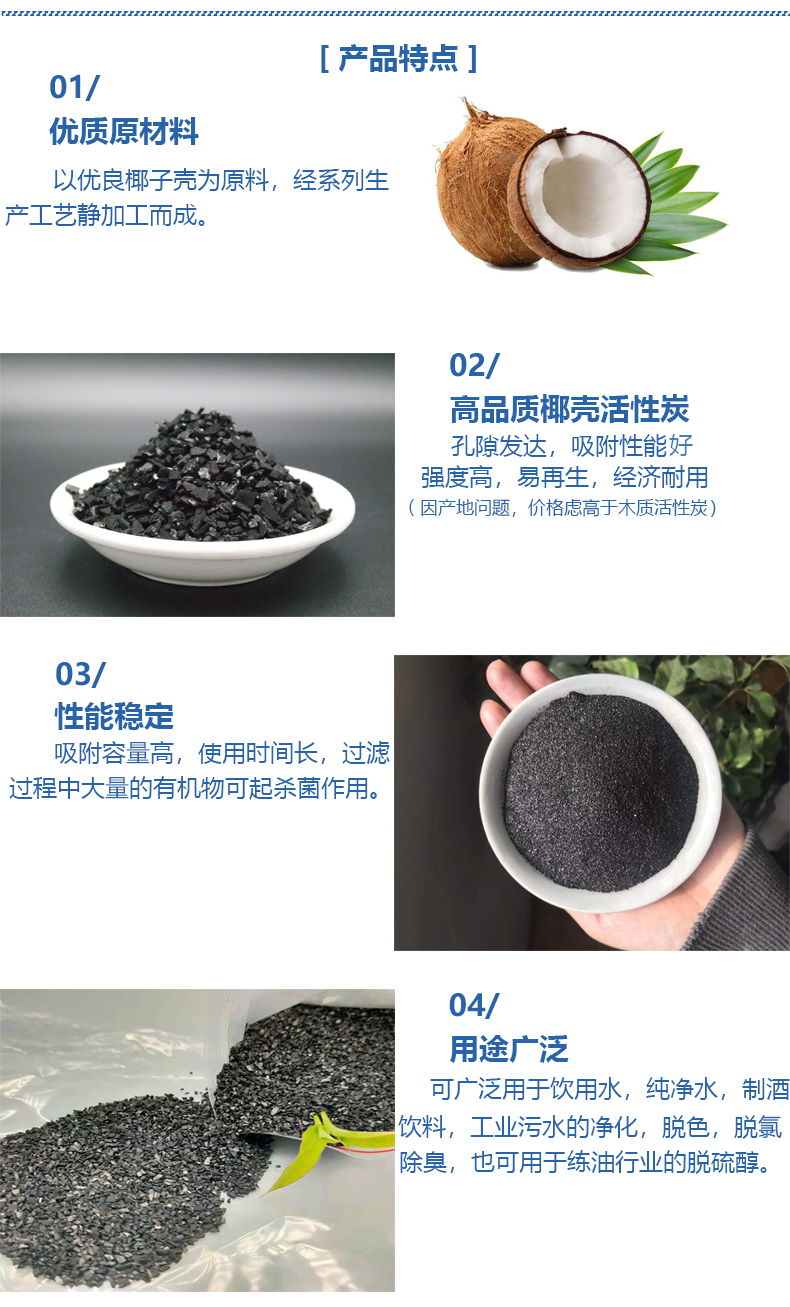 3、凈水椰殼活性炭:對純凈水,高純水凈有好的效能。是電子工業(yè),啤酒及高級(jí)凈化水設(shè)備的理想材料。